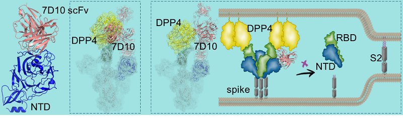 此次研究首先鉴定了MERS-CoV单克隆中和抗体7D10,这株抗体结合刺突蛋白的NTD,能够高效中和MERS-CoV假病毒、活病毒对细胞的感染以及高滴度假病毒对小鼠模型的感染。对NTD与7D10复合物的晶体结构测定以及位点突变研究揭示了一个位于刺突蛋白NTD上的全新表位。进一步研究表明,7D10的中和作用不只依赖于对DPP4结合的抑制,而且在病毒细胞附着后起作用,抑制膜融合前到膜融合后刺突蛋白的构象变化。这些特性使7D10对含有不同自然突变的MERS-CoV毒株具有广泛的中和能力,并与不同靶向RBD的中和抗体表现出协同作用或加和作用,为抗体药物与疫苗研发,防止MERS-CoV感染提供了新的理论依据和思路。