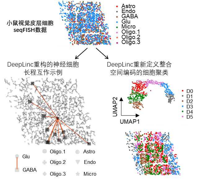 图2 DeepLinc重构的小鼠视觉皮层细胞互作网络,以一个谷氨酸能神经元与多个GABA能神经元之间的长程互作关系作为示例(下左);整合了细胞空间编码信息与互作关系之后,DeepLinc重新定义小鼠视觉皮层细胞聚类(下右)。