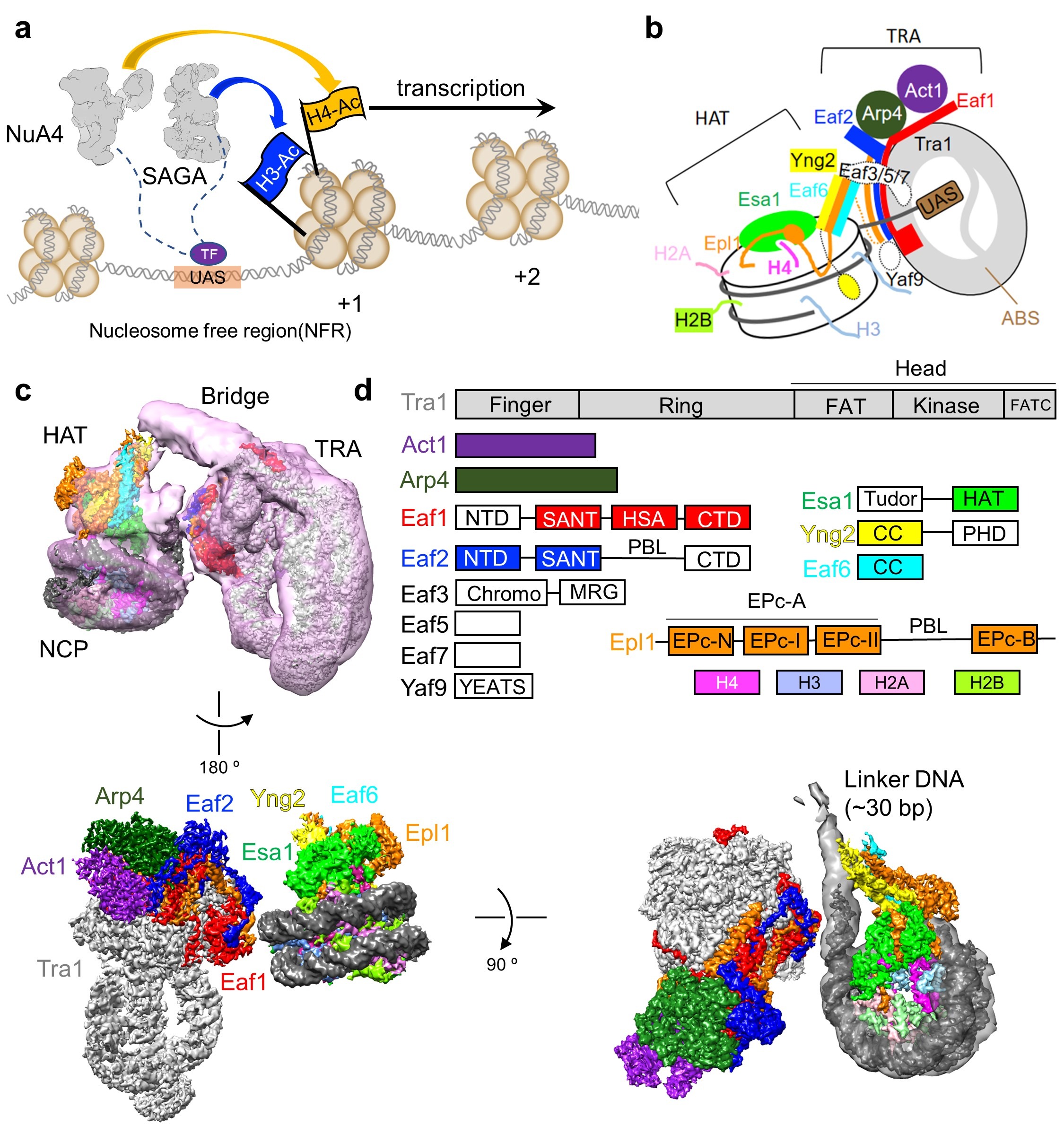 (a)NuA4与SAGA协同作用促进基因转录的工作模式图;(b)NuA4结合核小体的示意图;(c)NuA4-NCP复合物的电镜密度图。(d)NuA4各亚基结构域组成示意图,颜色与电镜密度图中一致。