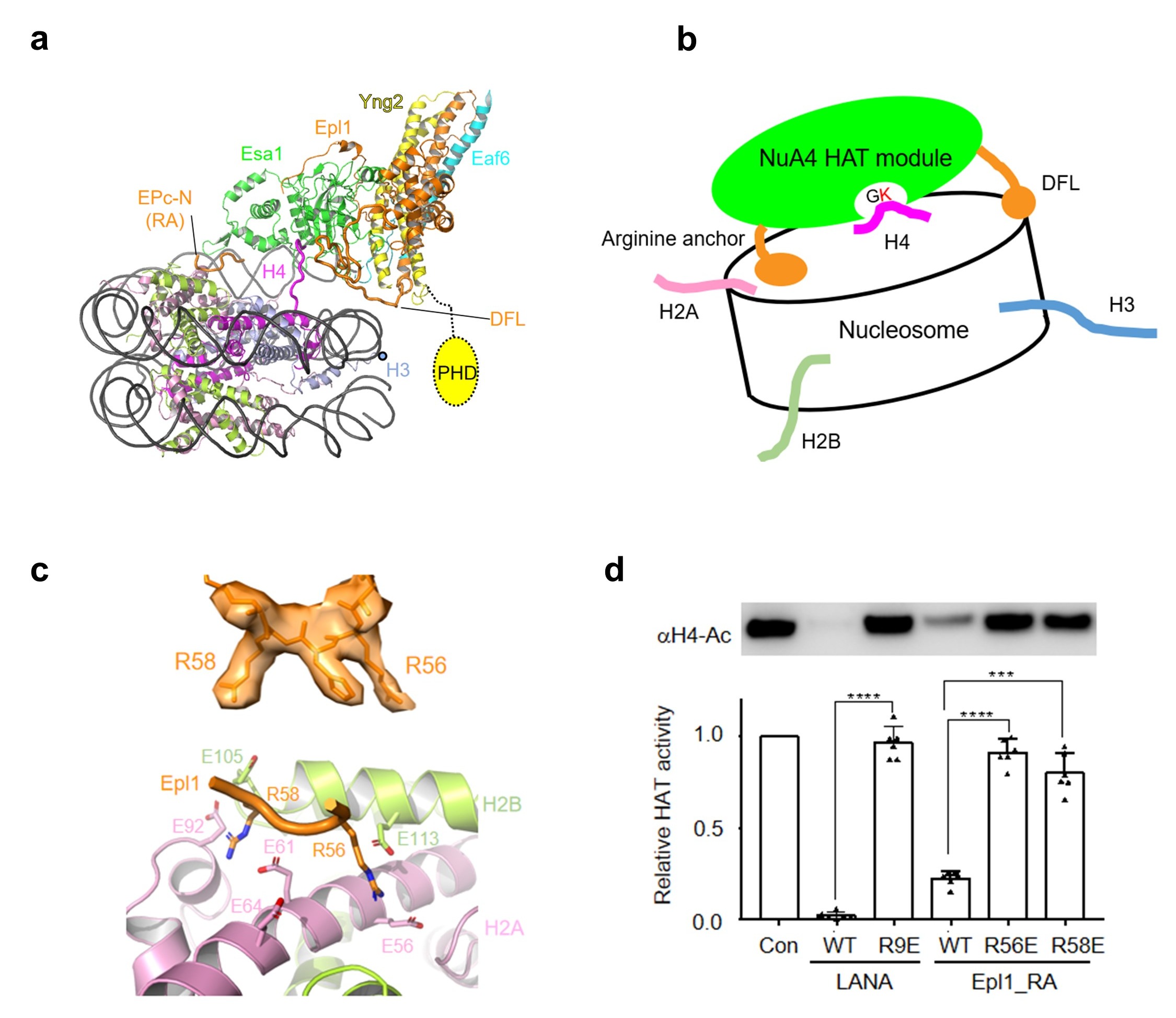 (a)HAT模块结合核小体的结构模型;(b)NuA4通过空间位置识别H4的模式图;(c)Arginine anchor局部电镜密度图及其与酸性区相互作用结构细节;(d)多肽竞争性实验显示Arginine anchor对NuA4乙酰化活性的重要性。